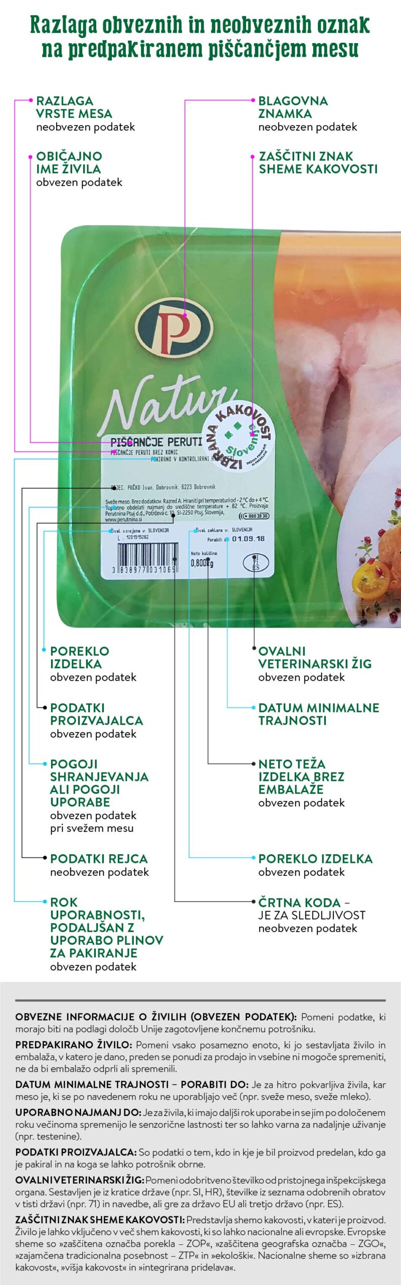Verjetno ste že opazili, da je slovensko predpakirano perutninsko in puranje meso, ki ga kupite v trgovini, opremljeno s precej oznakami. Veste, kaj pomenijo? Veste, kateri podatki morajo bitu obvezno navedeni, katere pa proizvajalci dodajo prostovoljno? Oglejte si v spodnji infografiki.