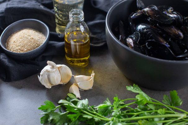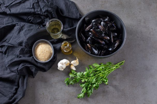 V širokem loncu segrejemo oljčno olje. Dodamo česen in ga med mešanjem zelo na hitro popražimo (samo toliko, da zadiši). Dodamo eno žlico drobtin, polovico sesekljanega peteršilja in vino. Dobro premešamo in zavremo.